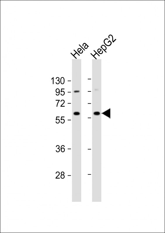 All lanes : Anti-NAPRT1 Antibody (N-term) at 1:1000 dilution Lane 1: Hela whole cell lysate Lane 2: HepG2 whole cell lysate Lysates/proteins at 20 μg per lane. Secondary Goat Anti-Rabbit IgG, (H+L), Peroxidase conjugated at 1/10000 dilution. Predicted band size : 58 kDa Blocking/Dilution buffer: 5% NFDM/TBST. |