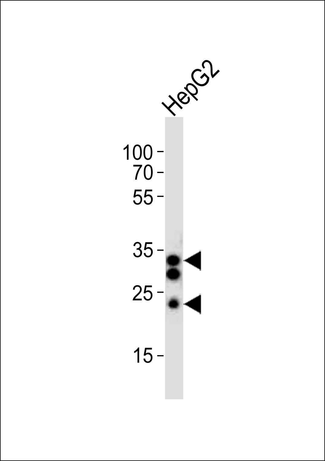 Western blot analysis of lysate from HepG2 cell line, using SULT1A1 Antibody (C-term)(Cat. APR10331G). APR10331G was diluted at 1:1000. A goat anti-rabbit IgG H&L(HRP) at 1:10000 dilution was used as the secondary antibody. Lysate at 20ug. |