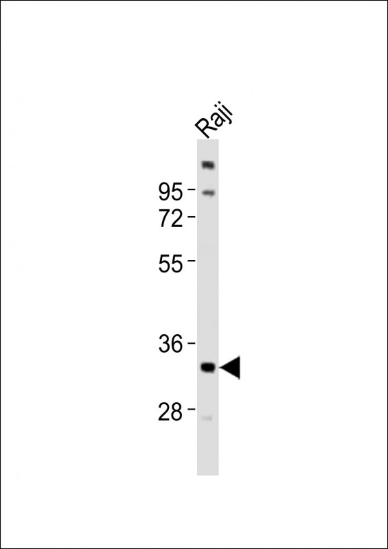 Anti-TNFRSF14 Antibody (C-term)at 1:1000 dilution + Raji whole cell lysates Lysates/proteins at 20 μg per lane. Secondary Goat Anti-Rabbit IgG, (H+L), Peroxidase conjugated at 1/10000 dilution Predicted band size : 30 kDa Blocking/Dilution buffer: 5% NFDM/TBST. |
