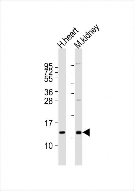 All lanes : Anti-CXCL12 Antibody at 1:2000 dilution Lane 1: human heart lysates Lane 2: mouse kidney lysates Lysates/proteins at 20 μg per lane. Secondary Goat Anti-Rabbit IgG, (H+L), Peroxidase conjugated at 1/10000 dilution Predicted band size : 11 kDa Blocking/Dilution buffer: 5% NFDM/TBST. |