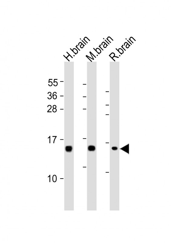 All lanes : Anti-NRGN Antibody (C-term) at 1:2000 dilution Lane 1: human brain lysates Lane 2: mouse brain lysates Lane 3: rat brain lysates Lysates/proteins at 20 μg per lane. Secondary Goat Anti-Rabbit IgG, (H+L), Peroxidase conjugated at 1/10000 dilution. Predicted band size : 8 kDa Blocking/Dilution buffer: 5% NFDM/TBST. |