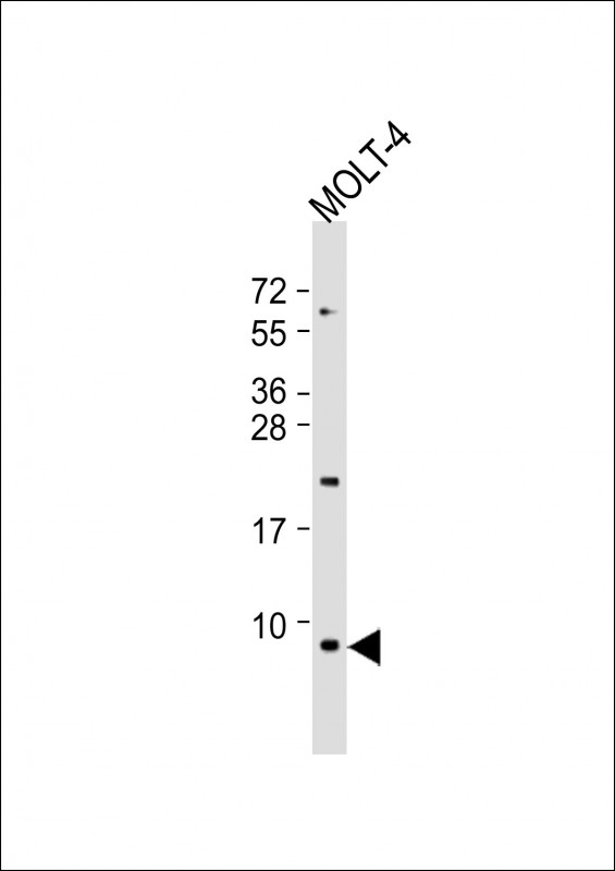 Anti-GNG5 Antibody (C-Term) at 1:1000 dilution + MOLT-4 whole cell lysate Lysates/proteins at 20 μg per lane. Secondary Goat Anti-Rabbit IgG, (H+L), Peroxidase conjugated at 1/10000 dilution. Predicted band size : 7 kDa Blocking/Dilution buffer: 5% NFDM/TBST. |