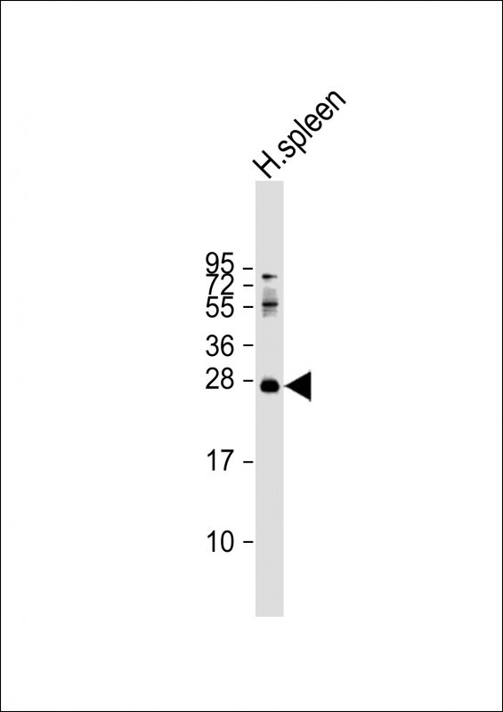 Anti-PRTN3 Antibody (C-term) at 1:2000 dilution + human spleen lysate Lysates/proteins at 20 μg per lane. Secondary Goat Anti-Rabbit IgG, (H+L), Peroxidase conjugated at 1/10000 dilution. Predicted band size : 28 kDa Blocking/Dilution buffer: 5% NFDM/TBST.
