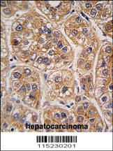 Formalin-fixed and paraffin-embedded human hepatocarcinoma tissue reacted with AKR1A1 antibody (C-term) (Cat. APG01646G), which was peroxidase-conjugated to the secondary antibody, followed by DAB staining. This data demonstrates the use of this antibody for immunohistochemistry; clinical relevance has not been evaluated.