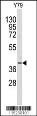 Western blot analysis of anti-AKR1A1 Antibody (C-term) (Cat. APG01646G) in Y79 cell line lysates (35ug/lane). AKR1A1(arrow) was detected using the purified Pab.