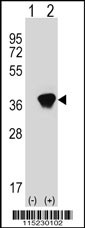 Western blot analysis of AKR1A1 (arrow) using rabbit polyclonal AKR1A1 Antibody (C-term) (Cat. APG01646G). 293 cell lysates (2 ug/lane) either nontransfected (Lane 1) or transiently transfected (Lane 2) with the AKR1A1 gene. |