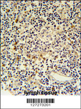 CORO6 Antibody (Center) (Cat. APR15566G) immunohistochemistry analysis in formalin fixed and paraffin embedded human lymph tissue followed by peroxidase conjugation of the secondary antibody and DAB staining. This data demonstrates the use of the CORO6 Antibody (Center) for immunohistochemistry. Clinical relevance has not been evaluated.