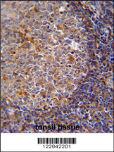 ARHGAP25 Antibody (Center) (Cat. APR15011G) immunohistochemistry analysis in formalin fixed and paraffin embedded human tonsil tissue followed by peroxidase conjugation of the secondary antibody and DAB staining. This data demonstrates the use of the ARHGAP25 Antibody (Center) for immunohistochemistry. Clinical relevance has not been evaluated. |