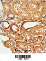 COQ9 Antibody (Center) (Cat. APR15557G) immunohistochemistry analysis in formalin fixed and paraffin embedded human lung tissue followed by peroxidase conjugation of the secondary antibody and DAB staining. This data demonstrates the use of the COQ9 Antibody (Center) for immunohistochemistry. Clinical relevance has not been evaluated.