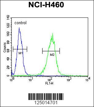COQ9 Antibody (Center) (Cat. APR15557G) flow cytometric analysis of NCI-H460 cells (right histogram) compared to a negative control cell (left histogram).FITC-conjugated goat-anti-rabbit secondary antibodies were used for the analysis. |