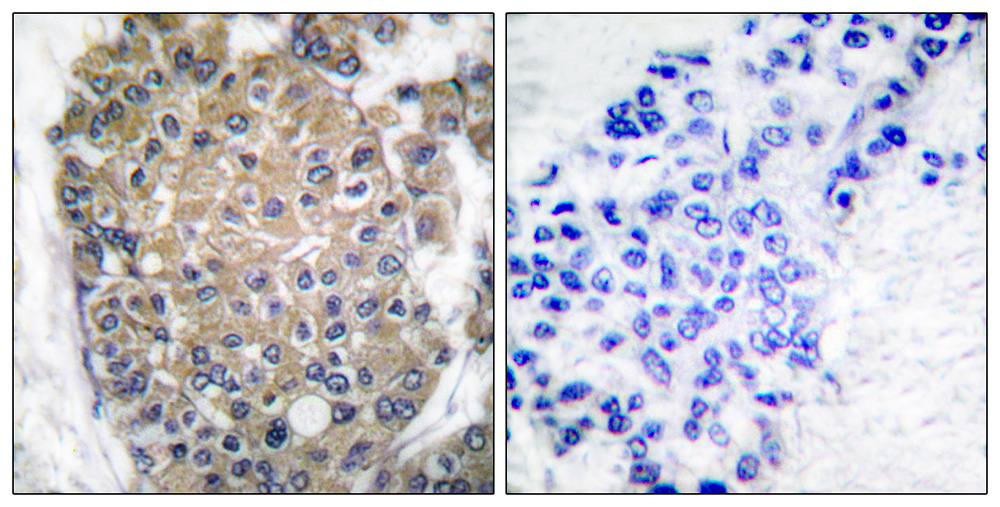 Immunohistochemical analysis of paraffin-embedded human breast carcinoma tissue using keratin 17 antibody. The negative controls in the IHC image is produced with the immunizing peptide. |