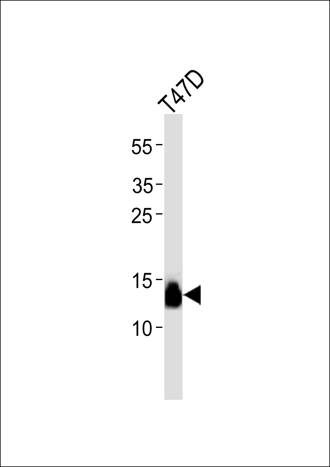 Western blot analysis of lysate from T47D cell line,using Synuclein γ Antibody(APR13644G). APR13644G was diluted at 1:1000. A goat anti-rabbit IgG H&L(HRP) at 1:5000 dilution was used as the secondary antibody.Lysate at 35ug.