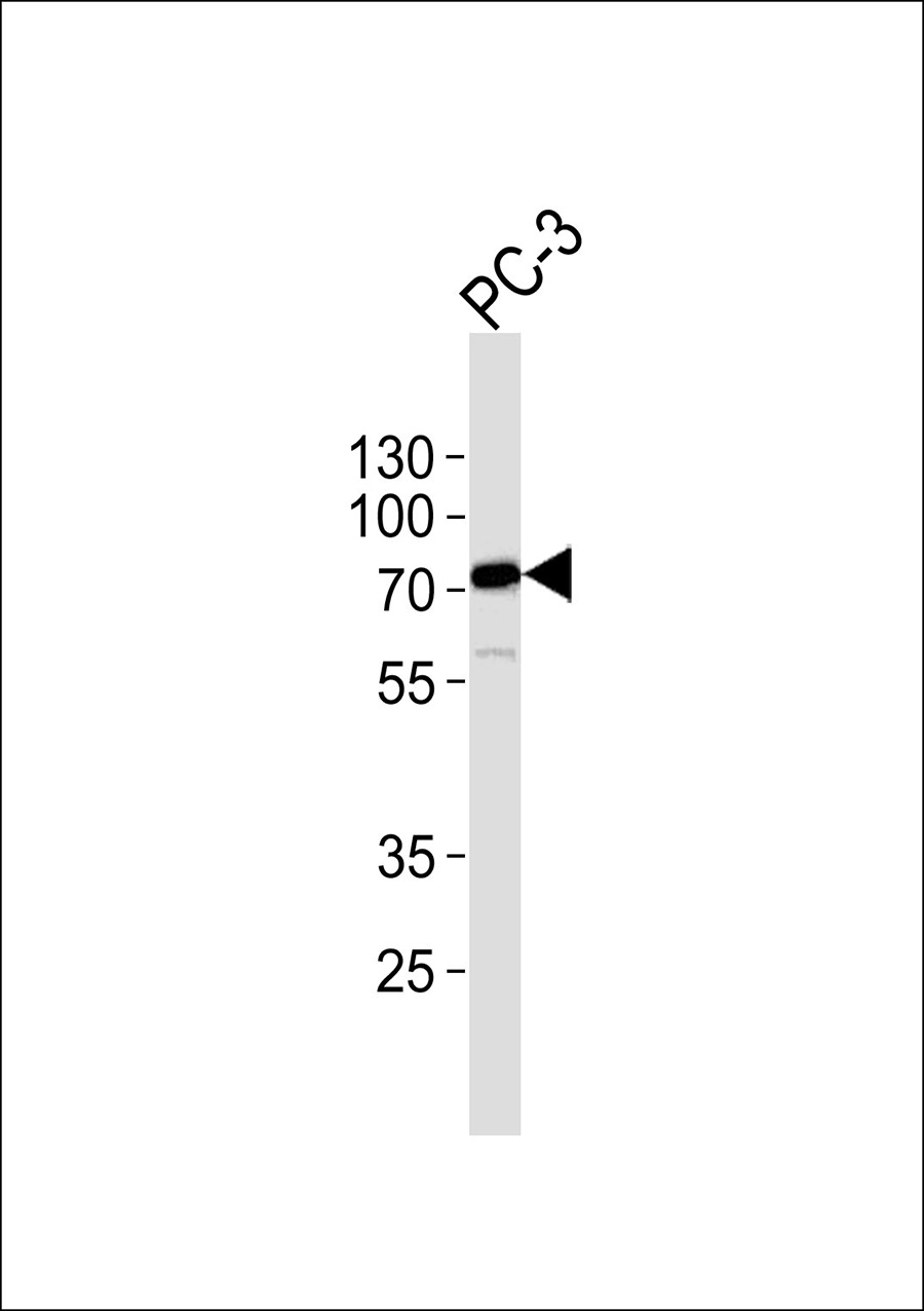 Western blot analysis of lysate from PC-3 cell line,using RABEP2 Antibody(AMM07500G). AMM07500G was diluted at 1:1000. A goat anti-rabbit IgG H&L(HRP) at 1:5000 dilution was used as the secondary antibody.Lysate at 35ug. |