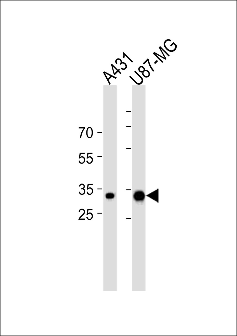 Western blot analysis of lysates from A431,U-87 MG cell line (from left to right),using CYB5R3 Antibody(APG02847G). APG02847G was diluted at 1:1000 at each lane. A goat anti-rabbit IgG H&L(HRP) at 1:5000 dilution was used as the secondary antibody.Lysates at 35ug per lane.