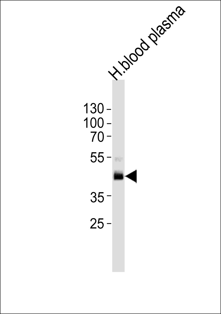 Western blot analysis of lysate from human blood plasma tissue lysate,using LRG1 Antibody(APR17233G). APR17233G was diluted at 1:1000. A goat anti-rabbit IgG H&L(HRP) at 1:5000 dilution was used as the secondary antibody.Lysate at 35ug. |