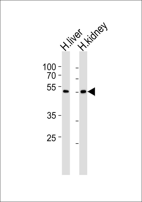 Western blot analysis of lysates from human liver and kidney tissue lysate (from left to right),using DMGDH Antibody(APR07599G). APR07599G was diluted at 1:1000 at each lane. A goat anti-rabbit IgG H&L(HRP) at 1:5000 dilution was used as the secondary antibody.Lysates at 35ug per lane. |