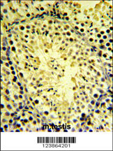 DGKK Antibody (C-term) (Cat. APR15732G) IHC analysis in formalin fixed and paraffin embedded mouse testis tissue followed by peroxidase conjugation of the secondary antibody and DAB staining. This data demonstrates the use of the DGKK Antibody (C-term) for immunohistochemistry. Clinical relevance has not been evaluated. |