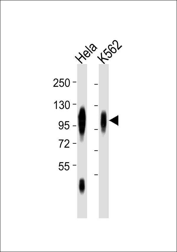 All lanes : Anti-CD107a Antibody at 1:1000 dilution Lane 1: Hela whole cell lysates Lane 2: K562 whole cell lysates Lysates/proteins at 20 μg per lane. Secondary Goat Anti-Rabbit IgG, (H+L),Peroxidase conjugated at 1/10000 dilution Predicted band size : 45 kDa Blocking/Dilution buffer: 5% NFDM/TBST. |