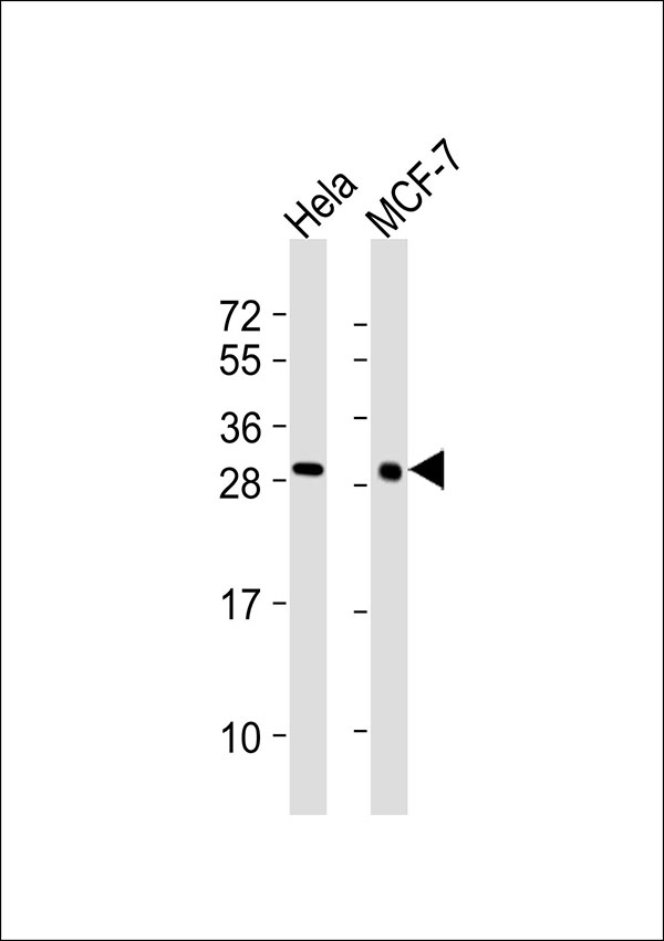 All lanes : Anti-Galectin 3 Antibody at 1:1000 dilution Lane 1: Hela whole cell lysates Lane 2: MCF-7 whole cell lysates Lysates/proteins at 20 μg per lane. Secondary Goat Anti-Rabbit IgG, (H+L),Peroxidase conjugated at 1/10000 dilution Predicted band size : 31 kDa Blocking/Dilution buffer: 5% NFDM/TBST. |