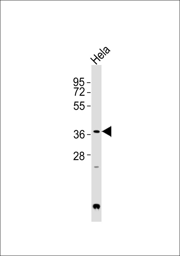 Anti-Galectin 9 Antibodyat 1:1000 dilution + Hela whole cell lysates Lysates/proteins at 20 μg per lane. Secondary Goat Anti-Rabbit IgG, (H+L),Peroxidase conjugated at 1/10000 dilution Predicted band size : 40 kDa Blocking/Dilution buffer: 5% NFDM/TBST. |