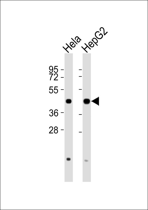 All lanes : Anti-PDHA1 Antibody at 1:1000 dilution Lane 1: Hela whole cell lysates Lane 2: HepG2 whole cell lysates Lysates/proteins at 20 μg per lane. Secondary Goat Anti-Rabbit IgG, (H+L),Peroxidase conjugated at 1/10000 dilution Predicted band size : 43 kDa Blocking/Dilution buffer: 5% NFDM/TBST. |