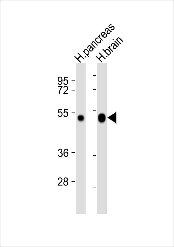All lanes : Anti-CXADR Antibody at 1:1000 dilution Lane 1: human pancreas lysates Lane 2: human brain lysates Lysates/proteins at 20 μg per lane. Secondary Goat Anti-Rabbit IgG, (H+L),Peroxidase conjugated at 1/10000 dilution Predicted band size : 40 kDa Blocking/Dilution buffer: 5% NFDM/TBST. |
