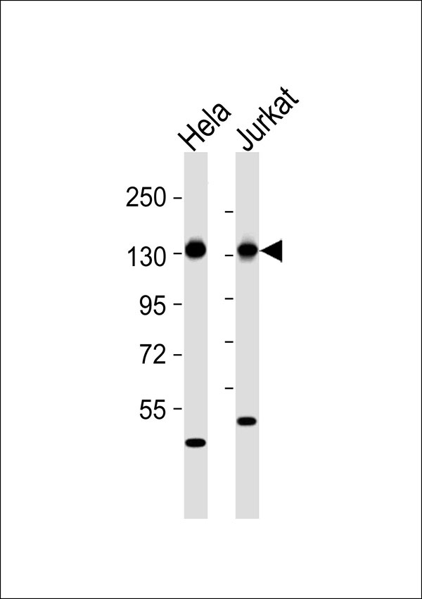 All lanes : Anti-RAB3GAP1 Antibody at 1:1000 dilution Lane 1: Hela whole cell lysates Lane 2: Jurkat whole cell lysates Lysates/proteins at 20 μg per lane. Secondary Goat Anti-Rabbit IgG, (H+L),Peroxidase conjugated at 1/10000 dilution Predicted band size : 111 kDa Blocking/Dilution buffer: 5% NFDM/TBST. |