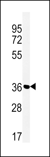 Western blot analysis of MFRN2 Antibody (N-term) (Cat. APR17361G) in Jurkat cell line lysates (35ug/lane).MFRN2 (arrow) was detected using the purified Pab.