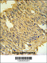 MFRN2 Antibody (N-term) (Cat. APR17361G) IHC analysis in formalin fixed and paraffin embedded human lung carcinoma followed by peroxidase conjugation of the secondary antibody and DAB staining. This data demonstrates the use of the MFRN2 Antibody (N-term) for immunohistochemistry. Clinical relevance has not been evaluated. |