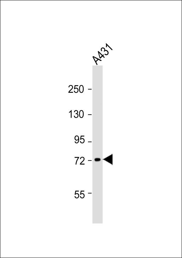 Anti-GBP4 Antibody at 1:1000 dilution + A431 whole cell lysate Lysates/proteins at 20 μg per lane. Secondary Goat Anti-Rabbit IgG, (H+L),Peroxidase conjugated at 1/10000 dilution. Predicted band size : 73 kDa Blocking/Dilution buffer: 5% NFDM/TBST. |