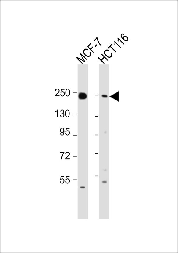 All lanes : Anti-Myosin 14 Antibody at 1:1000 dilution Lane 1: MCF-7 whole cell lysate Lane 2: HCT116 whole cell lysate Lysates/proteins at 20 μg per lane. Secondary Goat Anti-Rabbit IgG, (H+L),Peroxidase conjugated at 1/10000 dilution. Predicted band size : 228 kDa Blocking/Dilution buffer: 5% NFDM/TBST. |