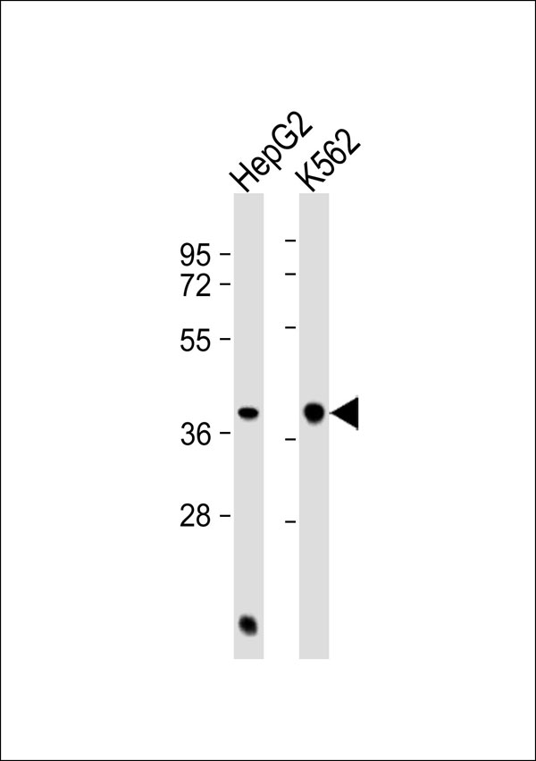 All lanes : Anti-Renin Antibody at 1:1000 dilution Lane 1: HepG2 whole cell lysate Lane 2: K562 whole cell lysate Lysates/proteins at 20 μg per lane. Secondary Goat Anti-Rabbit IgG, (H+L),Peroxidase conjugated at 1/10000 dilution. Predicted band size : 45 kDa Blocking/Dilution buffer: 5% NFDM/TBST. |