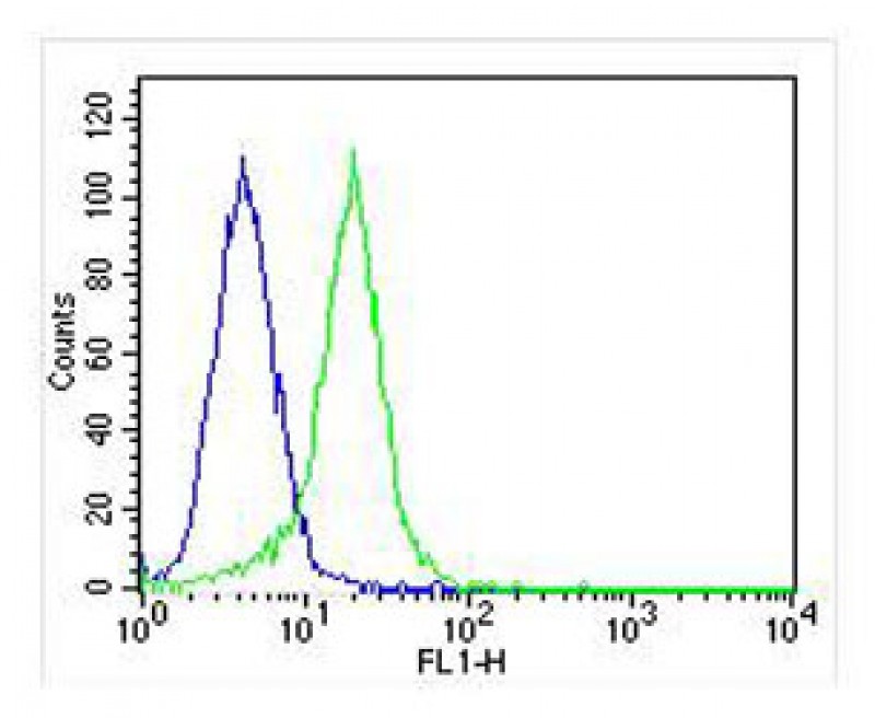 Overlay histogram showing Hela cells stained with APR07946G (green line). The cells were fixed with 2% paraformaldehyde (10 min) and then permeabilized with 90% methanol for 10 min. The cells were then icubated in 2% bovine serum albumin to block non-specific protein-protein interactions followed by the antibody (APR07946G, 1:25 dilution) for 60 min at 37?C. The secondary antibody used was Goat-Anti-Rabbit IgG, DyLight? 488 Conjugated Highly Cross-Adsorbed(NA168821) at 1/400 dilution for 40 min at 37?C. Isotype control antibody (blue line) was Rabbit IgG (1μg/1x10^6 cells) used under the same conditions. Acquisition of >10, 000 events was performed.