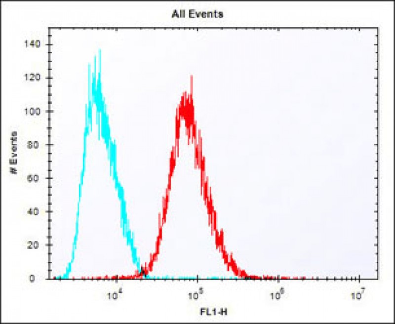 Overlay histogram showing HepG2 cells stained with APR07946G (red line). The cells were fixed with 2% paraformaldehyde (10 min) and then permeabilized with 90% methanol for 10 min. The cells were then icubated in 2% bovine serum albumin to block non-specific protein-protein interactions followed by the antibody (APR07946G, 1:25 dilution) for 60 min at 37?C. The secondary antibody used was Alexa Fluor? 488 goat anti-rabbit lgG (H+L) (1583138) at 1/400 dilution for 40 min at 37?C. Isotype control antibody (blue line) was rabbit IgG1 (1μg/1x10^6 cells) used under the same conditions. Acquisition of >10, 000 events was performed. |