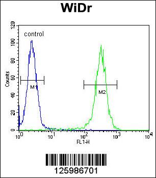 B4GALT5 Antibody (C-term) (Cat. APG02156G) flow cytometric analysis of WiDr cells (right histogram) compared to a negative control cell (left histogram).FITC-conjugated goat-anti-rabbit secondary antibodies were used for the analysis. |