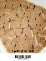 GGNBP2 Antibody (C-term) (Cat. APR16133G) immunohistochemistry analysis in formalin fixed and paraffin embedded human skeletal muscle followed by peroxidase conjugation of the secondary antibody and DAB staining. This data demonstrates the use of the GGNBP2 Antibody (C-term) for immunohistochemistry. Clinical relevance has not been evaluated.