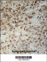 C14orf179 Antibody (Center) (Cat. APR15189G) immunohistochemistry analysis in formalin fixed and paraffin embedded human lung carcinoma followed by peroxidase conjugation of the secondary antibody and DAB staining. This data demonstrates the use of the C14orf179 Antibody (Center) for immunohistochemistry. Clinical relevance has not been evaluated.