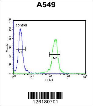 C14orf179 Antibody (Center) (Cat. APR15189G) flow cytometric analysis of A549 cells (right histogram) compared to a negative control cell (left histogram).FITC-conjugated goat-anti-rabbit secondary antibodies were used for the analysis. |