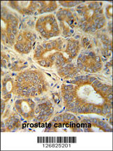 CRABP1 Antibody (C-term) (Cat. APR15582G) immunohistochemistry analysis in formalin fixed and paraffin embedded human prostate carcinoma followed by peroxidase conjugation of the secondary antibody and DAB staining. This data demonstrates the use of the CRABP1 Antibody (C-term) for immunohistochemistry. Clinical relevance has not been evaluated. |