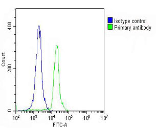 Overlay histogram showing THP-1 cells stained with APR07213G (green line). The cells were fixed with 2% paraformaldehyde (10 min) and then permeabilized with 90% methanol for 10 min. The cells were then icubated in 2% bovine serum albumin to block non-specific protein-protein interactions followed by the antibody (APR07213G, 1:25 dilution) for 60 min at 37?C. The secondary antibody used was Goat-Anti-Rabbit IgG, DyLight? 488 Conjugated Highly Cross-Adsorbed(OH191631) at 1/200 dilution for 40 min at 37?C. Isotype control antibody (blue line) was rabbit IgG (1μg/1x10^6 cells) used under the same conditions. Acquisition of >10, 000 events was performed.