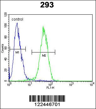 CLDN12 Antibody (N-term) (Cat. APR15476G) flow cytometric analysis of 293 cells (right histogram) compared to a negative control cell (left histogram).FITC-conjugated goat-anti-rabbit secondary antibodies were used for the analysis. |