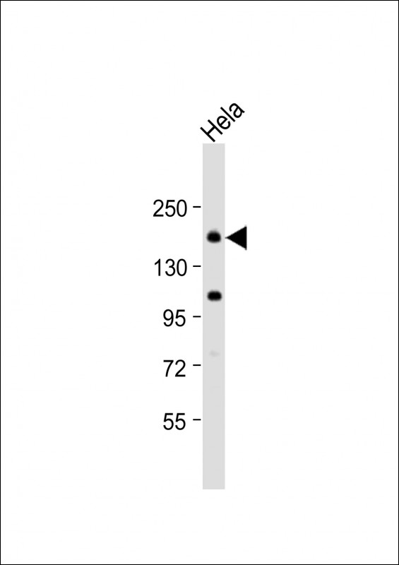 Anti-CLTC Antibody (Center) at 1:1000 dilution + Hela whole cell lysate Lysates/proteins at 20 μg per lane. Secondary Goat Anti-Rabbit IgG, (H+L), Peroxidase conjugated at 1/10000 dilution. Predicted band size : 192 kDa Blocking/Dilution buffer: 5% NFDM/TBST.
