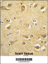CLTC antibody (Center) (Cat. APR15524G) immunohistochemistry analysis in formalin fixed and paraffin embedded human brain tissue followed by peroxidase conjugation of the secondary antibody and DAB staining. This data demonstrates the use of the CLTC antibody (Center) for immunohistochemistry. Clinical relevance has not been evaluated.