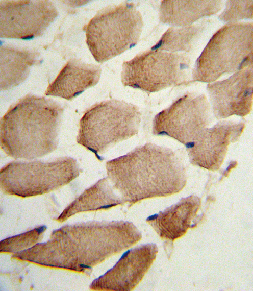 Formalin-fixed and paraffin-embedded human skeletal muscle reacted with ARPC1A Antibody (C-term), which was peroxidase-conjugated to the secondary antibody, followed by DAB staining. This data demonstrates the use of this antibody for immunohistochemistry; clinical relevance has not been evaluated.