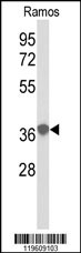 Western blot analysis of EEF1D antibody (N-term) (Cat. AMM07016G) in Ramos cell line lysates (35ug/lane). EEF1D (arrow) was detected using the purified Pab.