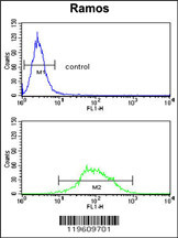 EEF1D Antibody (N-term) (Cat. AMM07016G) flow cytometry analysis of Ramos cells (bottom histogram) compared to a negative control cell (top histogram).FITC-conjugated goat-anti-rabbit secondary antibodies were used for the analysis. |