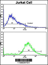 Flow cytometric analysis of jurkat cells using VIP Antibody (C-term)(bottom histogram) compared to a negative control cell (top histogram). FITC-conjugated goat-anti-rabbit secondary antibodies were used for the analysis. |