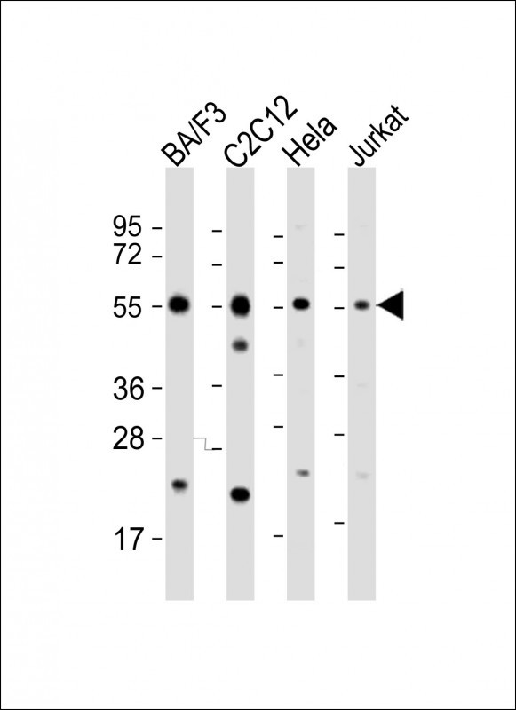 All lanes : Anti-CASP8 Antibody (C-term) at 1:2000 dilution Lane 1: BA/F3 whole cell lysate Lane 2: C2C12 whole cell lysate Lane 3: Hela whole cell lysate Lane 4: Jurkat whole cell lysate Lysates/proteins at 20 μg per lane. Secondary Goat Anti-Rabbit IgG, (H+L), Peroxidase conjugated at 1/10000 dilution. Predicted band size : 55 kDa Blocking/Dilution buffer: 5% NFDM/TBST. |