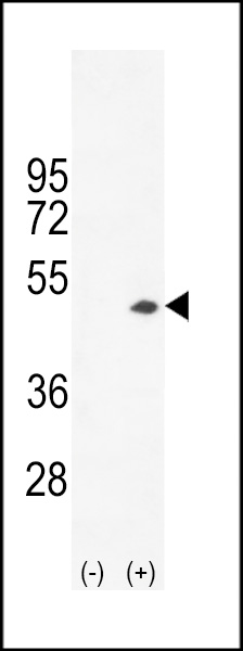 Western blot analysis of CKB (arrow) using rabbit polyclonal CKB-C254 (Cat. APG02772G). 293 cell lysates (2 ug/lane) either nontransfected (Lane 1) or transiently transfected (Lane 2) with the CKB gene.