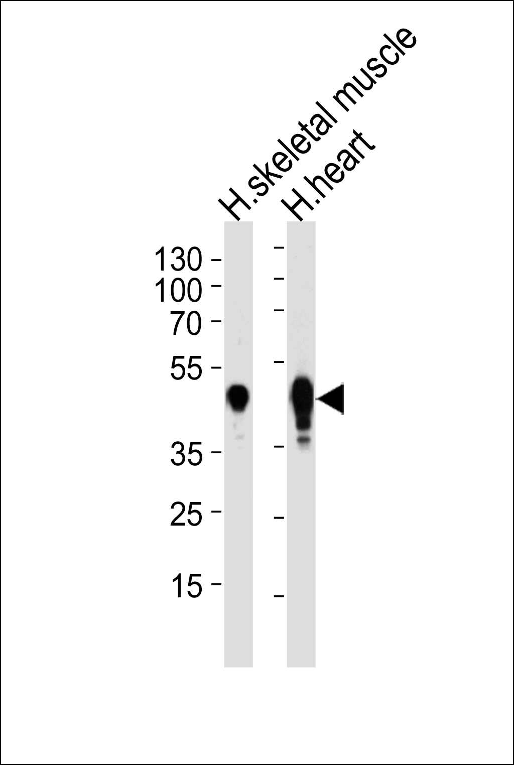 Western blot analysis of lysates from human skeletal muscle and heart tissue lysates (from left to right), using CKMT2 Antibody (D406)(Cat. APG02644G). APG02644G was diluted at 1:1000 at each lane. A goat anti-rabbit IgG H&L(HRP) at 1:5000 dilution was used as the secondary antibody. Lysates at 35ug per lane. |